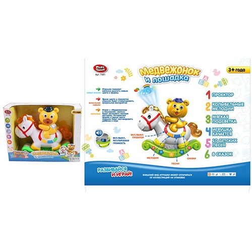 Особенности Отверстие для батареек не открыть без помощи отвертки, а это значит то, что детские ручонки не доберутся до них. Батарейки обычные, пальчиковые (3 х АА / LR6 1.5V, в набор не входят). Проектор находится в голове у лошадки. При включении он начинает показывать красочные картинки. Имеется два режима громкости звука. Игрушка качается, аналог неваляшки. ?Код товара×000.000623.742 Возрастная категория 3+ Размер в упаковке, см 27x9x21 Тип аккумулятора Батарейки АА / LR6 Материал пластик Страна бренда Китай Страна производитель Китай Гарантия 14 дней