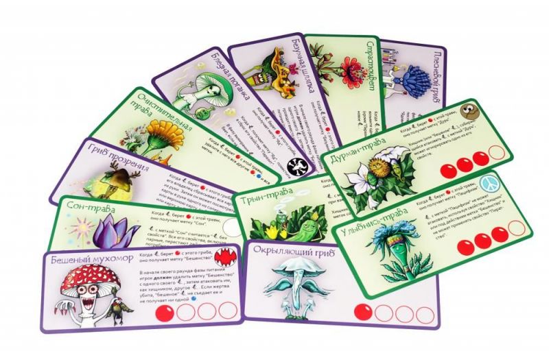 325.407 Возрастная категория Взрослый Количество элементов 24 карты травы и грибов; 32 метки последствий; 27 фишек еды; 2 пустых карты травы и грибов; Правила игры Количество игроков 2–4 Материал картон Страна бренда Россия Страна производитель Россия Гарантия 14 месяцев