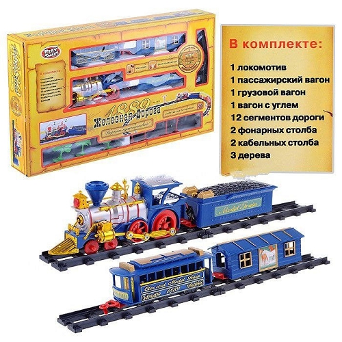 Особенности свет, звук ?Код товара×000.000182.990 Количество деталей, шт 1 локомотив, 1 пассажирский вагон, 1 грузовой вагон, 1 вагон с углём, 2 фонарных столба, 2 кабельных столба, 3 дерева, 12 сегментов дороги. Возрастная категория 3+ Размер в упаковке, см 53х32х7 Вес, г 960 Материал Пластик Страна бренда Китай Страна производитель Китай Гарантия 14 дней