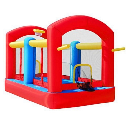 Габариты: 336х240х240 см. Имеет гарантированно высокое качество, надежен и безопасен, быстро устанавливается (надувается до 1 мин)/сворачивается (сдувается до 5 мин), может использоваться как домашних условиях, так и устанавливаться в парках, на морских пляжах и в других местах отдыха, вентилятор для надувания имеет низкий уровень шума ( до 50 дБ), наличие инструкции безопасности на внешней части. В конструкции надувного центра есть: волейбольная сетка на липучке с возможностью регулировки по высоте, внутренняя поверхность для игры 180-310 см, армирована сеткой, баскетбольное кольцо — 2 шт. Футбольные ворота с сеткой — 2 шт, 2 входных отверстия на липучке для большей безопасности самых маленьких игроков.