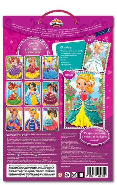 Особенности В наборе есть всё необходимое: специальный супермягкий пластилин для раскрашивания, стека, большая картинка-основа (А4 формата), подробная цветная инструкция, блёстки, салфетка. Картинка-основа – многоразовая (при желании с неё можно снять пластилин и начать работу заново). ?Код товара×000.000241.377 Возрастная категория 5+ Размер в упаковке, см 32,7х21,8х2 Вес, г 150 Страна бренда Россия Страна производитель Россия Гарантия 14 дней