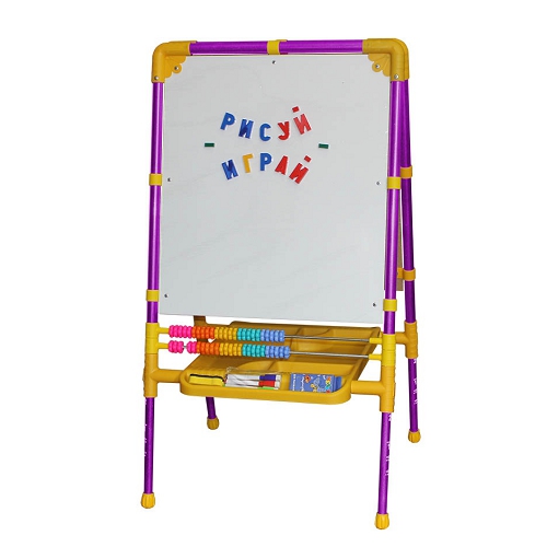 В комплекте: мольберт (рабочая поверхность 53 х 47 см), магнитная азбука, мелки, мозаика, маркеры (3 цвета), губка для стирания маркера.